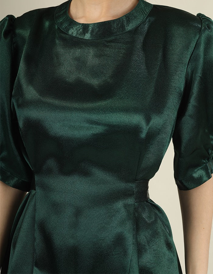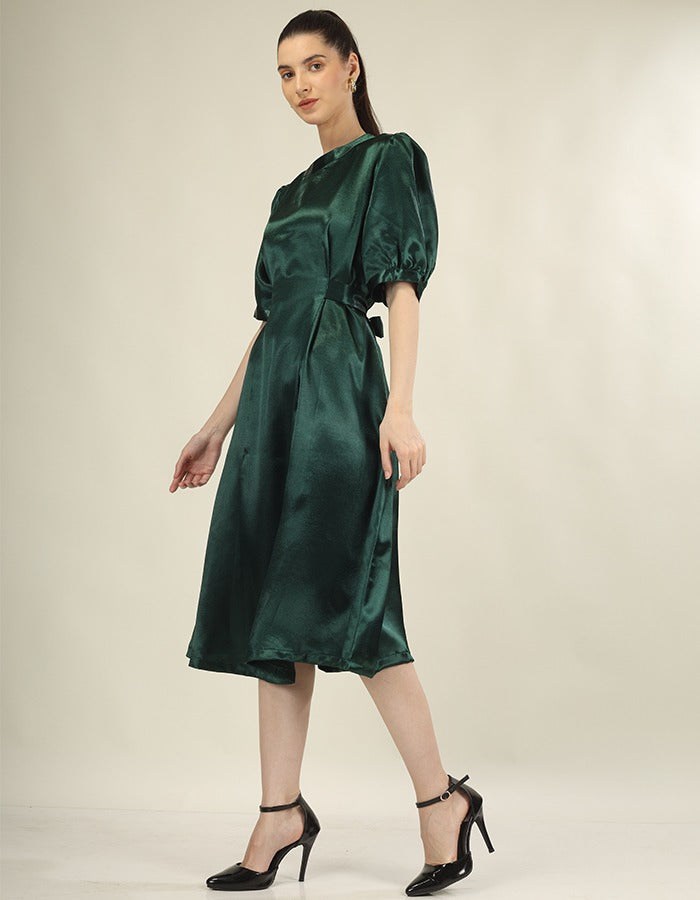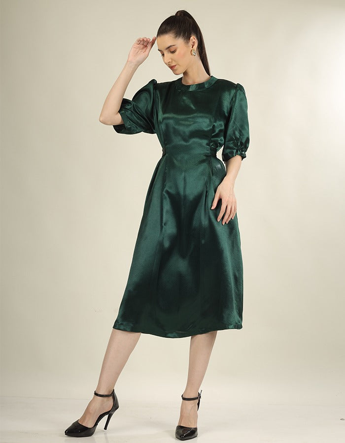 Beautiful green high fashion long dress with belt and puff sleeves is perfect for all occasions