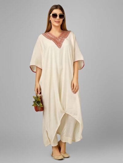 Effortlessly chic and endlessly comfortable, this kaftan blends relaxed elegance with versatile style. Crafted from soft, breathable fabric, it features a flowing silhouette that drapes beautifully on all body types. Perfect for lounging at home, beach vacations, or casual outings, this kaftan offers a breezy feel while keeping you stylish. Pair it with sandals or mojari for a laid-back look or dress it up with accessories for an evening out.”