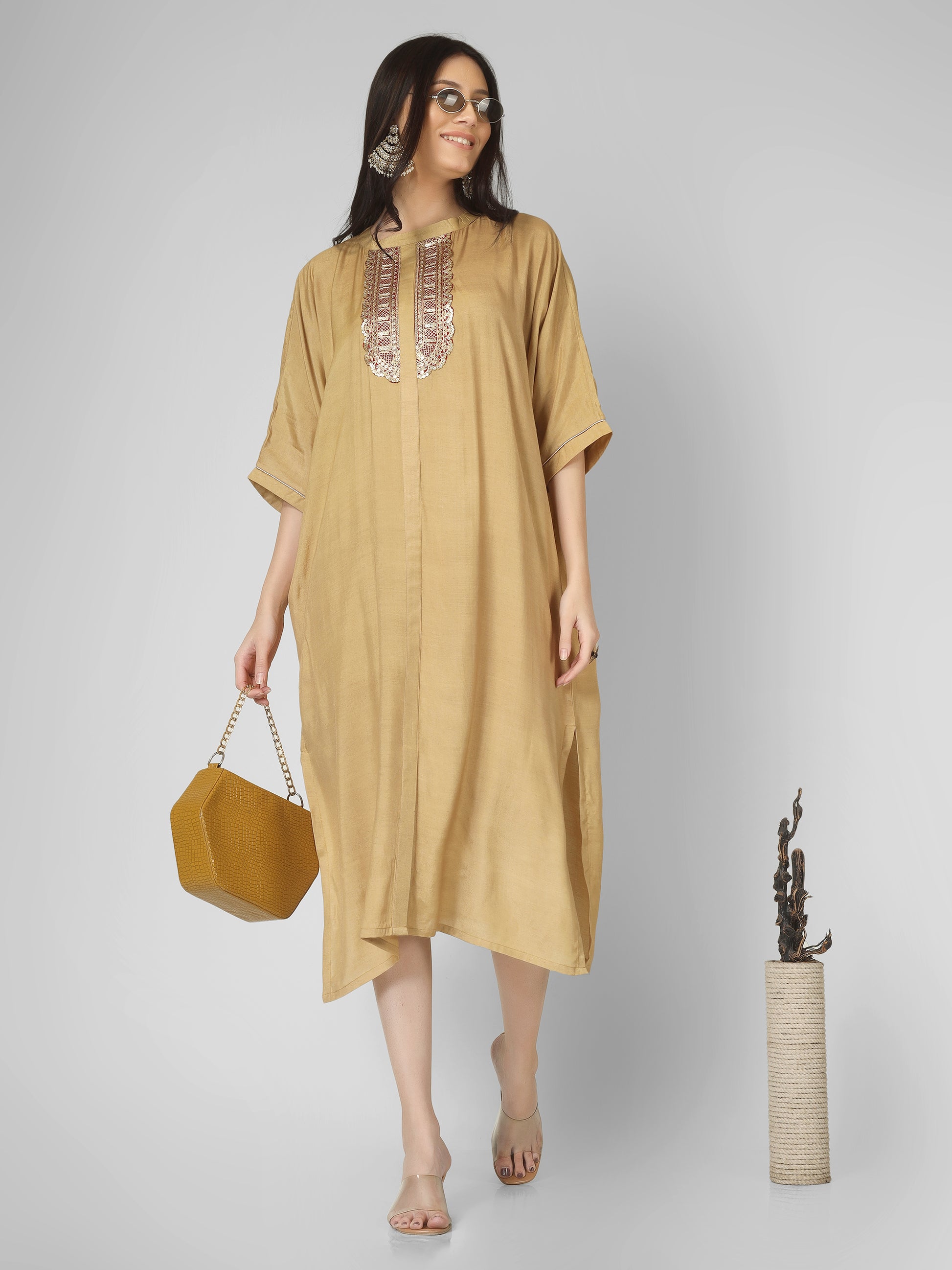 Step into refined ease and festive flair with this long kaftan dress, featuring a beautifully detailed gota-neckline and gently gathered silhouette for graceful movement. The designer hanging accents at the neck add a touch of celebratory charm. Wear it solo as a standout dress for an effortless chic look—or pair it with palazzo trousers to create an elegant suit-style ensemble. Crafted for comfort and versatility, it’s perfect for festive occasions, parties or relaxed gatherings where you want to look polished without overdoing it.
